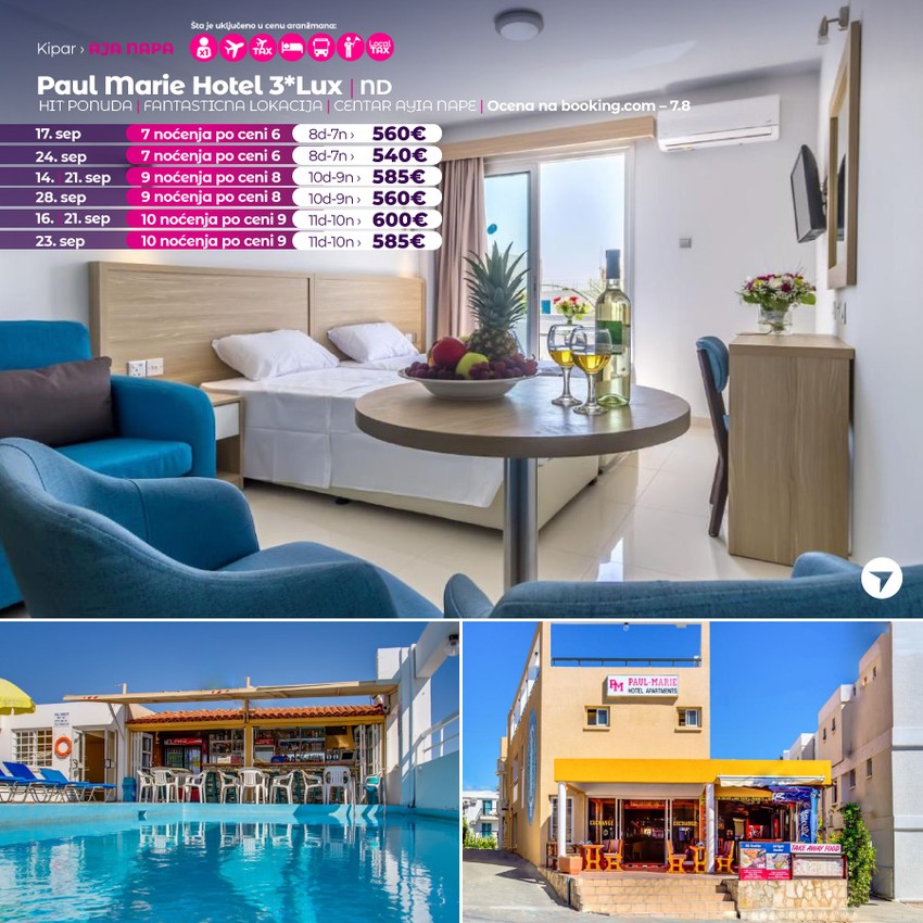 Objekat Paul Marie Hotel Apartments je smešten u centru letovališta Aja Napa i raspolaže restoranom i krovnim bazenom na otvorenom. WiFi je dostupan u zajedničkim prostorijama. Studiji i apartmani u objektu Paul Marie Hotel sadrže prostor za sedenje i balkon sa pogledom na vrt. Osim toga, imaju čajnu kuhinju sa pločama za kuvanje i posuđem. Kupatila u smeštajnim jedinicama su opremljena fenom za kosu i tušem. Objekat Paul Marie Hotel Apartments takođe nudi snek bar i recepciju koja radi non-stop. Međunarodni aerodrom Larnaka je udaljen oko 60 km. Ponuda objekta obuhvata i besplatan parking.