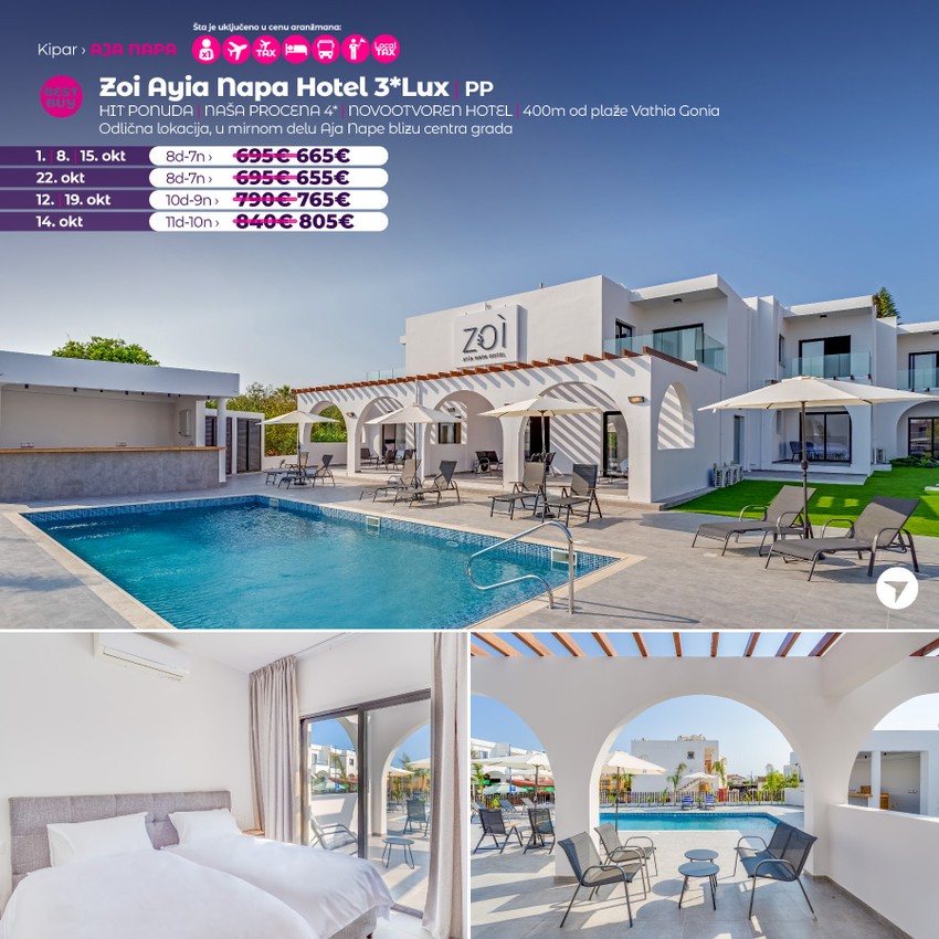 Predstavljamo vam hotel koji sredinom juna otvara svoja vrata za goste. U pitanju je potpuno nov hotel na odličnoj lokaciji. Nalazi se u Aja Napi, na 15 minuta šetnje od centra ovog mesta i u blizini plaze Vathia Gonia. U blizini hotela nalazi se brojni restorani, barovi i stanica gradskog prevoza. Hotel poseduje WiFi, bar kod recepcije, spoljašnji bazen i teretanu. Sobe su moderno opremljene, sa AC uređajem.