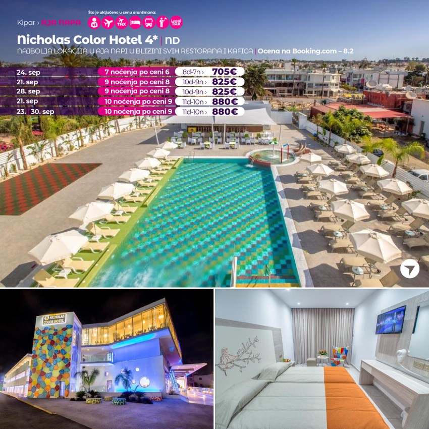 Ovaj objekat je udaljen 2 min hoda od plaže. Ovaj hotel je smešten na samo 300 metara od plaže, u srcu popularnog letovališta Aja Napa. U ponudi ima otvoreni bazen i klimatizovane sobe.Sobe hotela Nicholas Color imaju jedinstveno uređen enterijer u različitim paletama boja. Svaka soba sadrži flat-screen TV sa satelitskim kanalima i sopstveno kupatilo sa tušem. Sa balkona se pruža pogled na posed hotela.