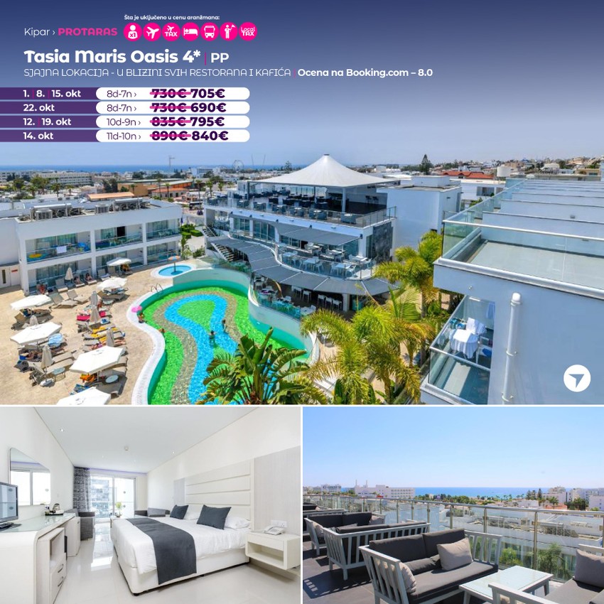 Smešten na padini, na samo 5 minuta hoda od centra Aja Nape, objekat Tasia Maris Oasis nudi moderno uređene smeštajne jedinice sa besplatnim bežičnim internetom i sopstvenim balkonom. Uključuje bazen slobodnog oblika, 2 restorana i 2 bara. Grčka plaža, najveća peščana plaža u Aja Napi, udaljena je samo 10 minuta hoda. Na pešačkoj udaljenosti nalaze se restorani, barovi i prodavnice. Parking u okviru objekta može se besplatno koristiti.