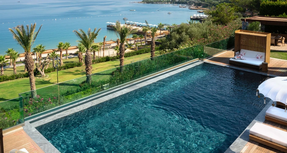 Iako na samo 8 kilometara od centra Bodruma, dobro je sačuvan od gradske žurbe, sakriven u zalivu nad kojim se nadvijaju ljupka brdašca. Njegovo sjajno prirodno okruženje – zelenilo trave, stabla palme i beli pesak – iskorišćeni su kao inspiracija za dizajn ovog velelepnog kompleksa ukrašenog mnoštvom bazena.
