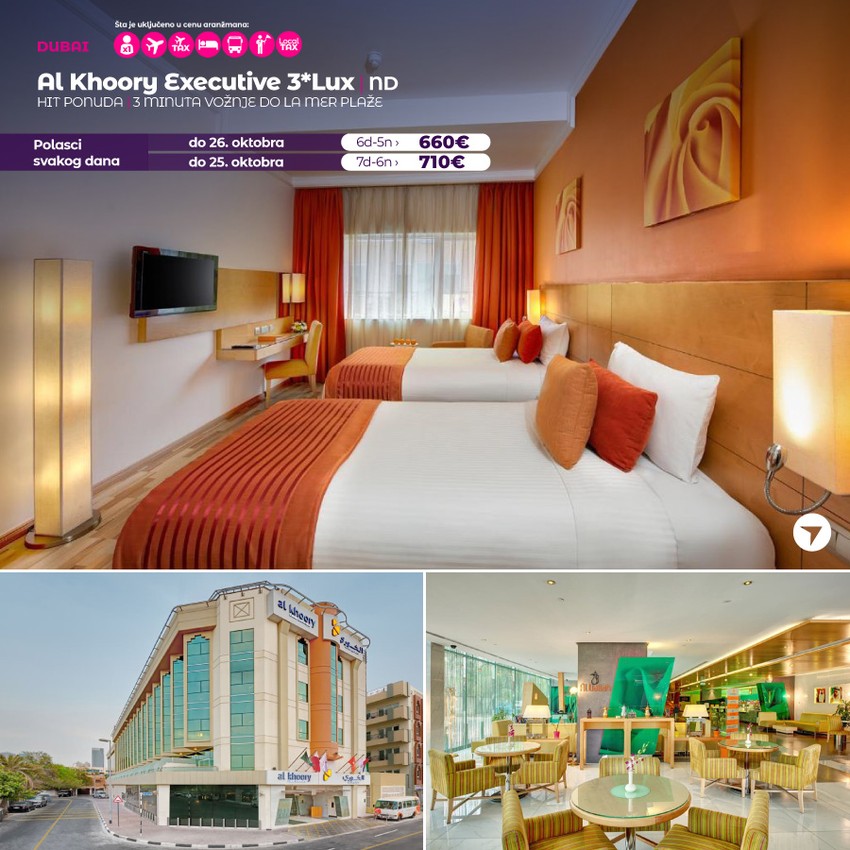 Smešten u srcu Dubaija, Corp Executive Al Khoory Hotel – Al Wasl je jedan od najboljih novih hotela smeštenih u ulici Al Wasl Road, pored Iranske bolnice. Udaljen je 15 minuta vožnje od aerodroma i samo par minuta vožnje od Međunarodnog konferencijskog i izlagačkog centra. Iz hotela se lako stiže do najvećih atrakcija Dubaija poput Burj Al Arab-a, Dubai Mall-a, Wild Wadi vodenog parka i dr.Hotel raspolaže sa 208 luksuznih soba. Svaka soba ima klimu, LCD TV, bežični internet velike brzine, elektronski sef, mini bar, pribor za pravljenje kafe i čaja, direktnu telefonsku liniju.
