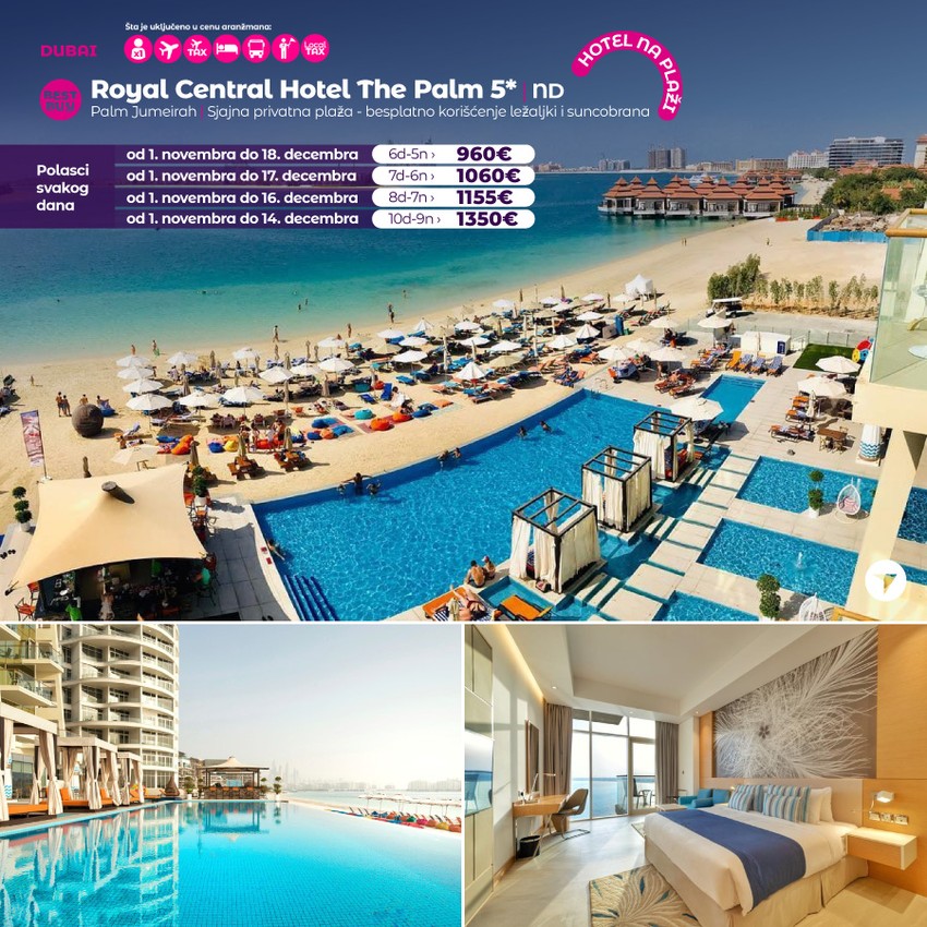 Ovaj objekat je udaljen 1 min hoda od plaže. Objekat Royal Central Hotel The Palm nalazi se u Dubaiju i ima privatni prostor na plaži. Gostima su na raspolaganju terasa i recepcija koja radi non-stop. U restoranu u okviru objekta služe se mediteranska jela. Sve smeštajne jedinice imaju flat-screen TV sa satelitskim kanalima, frižider, kuvalo, kadu i garderober. Svaka soba sadrži sopstveno kupatilo sa besplatnim toaletnim priborom. U hotelu se služi kontinentalni doručak ili doručak na bazi švedskog stola.