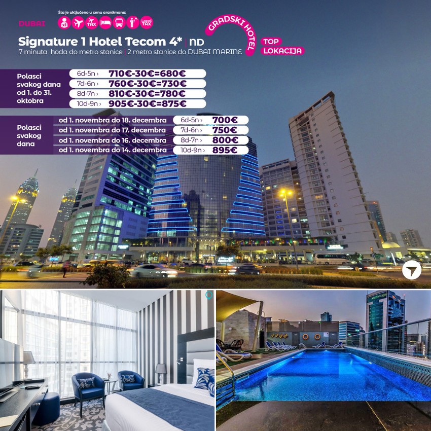Hotel se nalazi u oblasti Al Barsha Tecom, svega 5 minuta od Mall of The Emirates. Hotel ima otvoreni bazen koji je otvoren tokom cele godine. Sobe su klimatizovane, sa dnevnim boravkom, LCD televizorom i radnim stolom. Takođe, gostima je na raspolaganju mini bar i aparat za čaj i kafu. Hotel je udaljen 8km od Ibn Battuta Mall-a, dok je aerodrom u Dubaiju udaljen 30km.