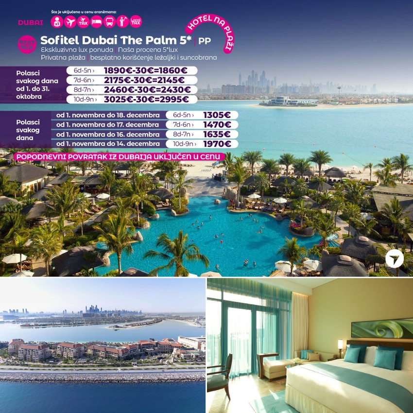 Sofitel Dubai The PalmResort & Spa 5*Lux Hotel je lociran na Jumeirah Palm ostrvu, 30minuta vožnje od Internacionalnog aerodroma u Dubaiju. Do hotel se lako dolazi taksijem ili autom, u blizini je Sheikh Zayed Road i Mall of Emirates. Ovaj luksuzan hotel obiluje sa velikim brojem restorana, barova i noćnih klubova, poseduje 6 bazena, spa centar, teniske terene, sportove na vodi, dečiji klub i dr...Hotel u svojoj ponudi ima veliki broj soba i apartmana kompletno opremljenih sa led tv, mini barom, king size krevetima, aparatima za spremanje kafe/caja, kupatilo sa kadom/tuš kabinom, fenom i dr.