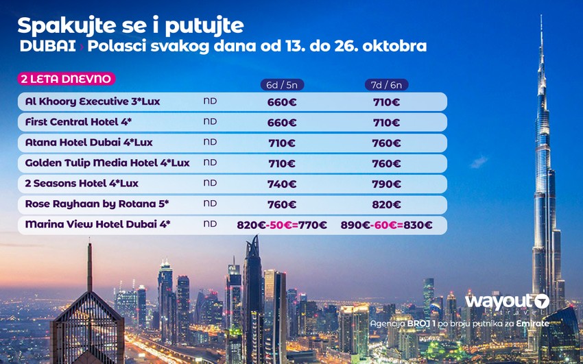 Definitivno jedna od najuzbudljivijih svetskih turističkih destinacije je biser Arabijskog poluostrva - magični Dubai. Fantastičan spoj luksuznog odmora, prelepih plaža, noćnog provoda i neodoljivog šopinga nikada nije bio bliži uz najpovoljnije ponude paket aranžmana agencije Wayout.