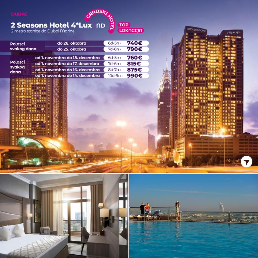 Apartmani u objektu Two Seasons Hotel & Apartments imaju elegantan nameštaj i zaseban salon sa flat-screen TV-om. Svaka smeštajna jedinica uključuje balkon sa panoramskim pogledom na Dubai i Palm Džumeiru (Palm Jumeirah). Gosti objekta Two Seasons Hotel & Apartments mogu da se opuste u 25-metarskom bazenu na otvorenom i hidromasažnoj kadi ili da se rekreiraju u dobro opremljenom fitnes centru i na terenima za skvoš. Ponuda uključuje odvojen dečji bazen i dečji klub za najmlađe goste.