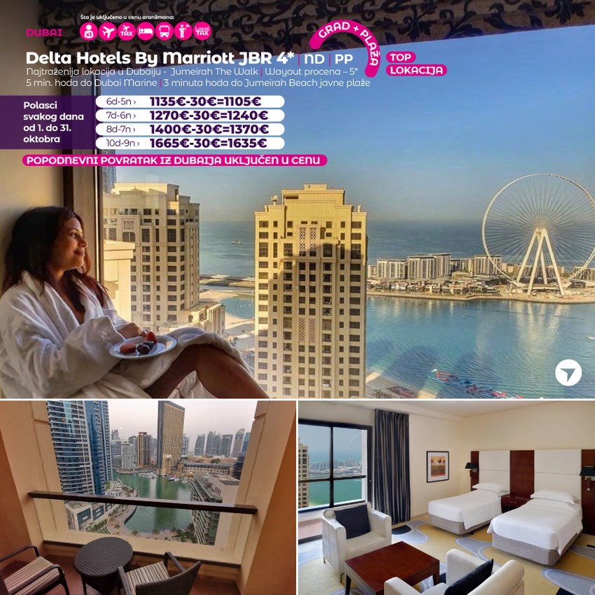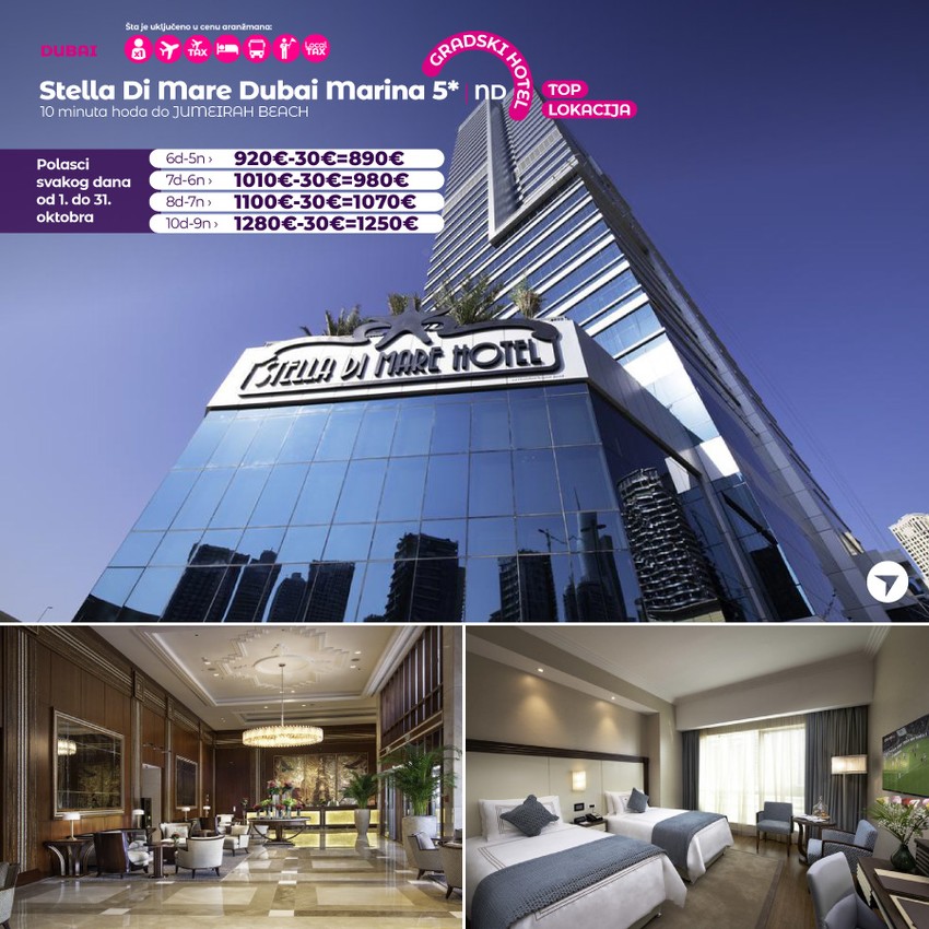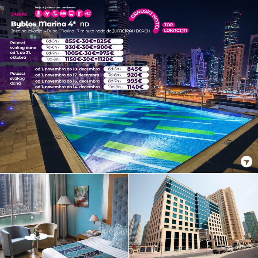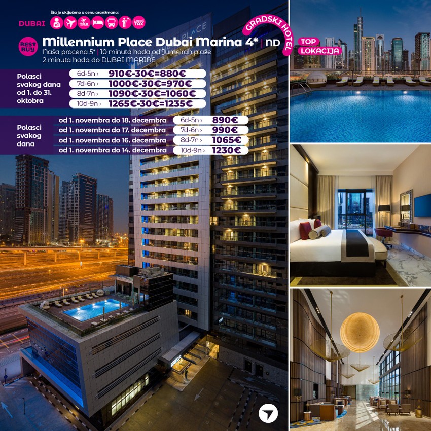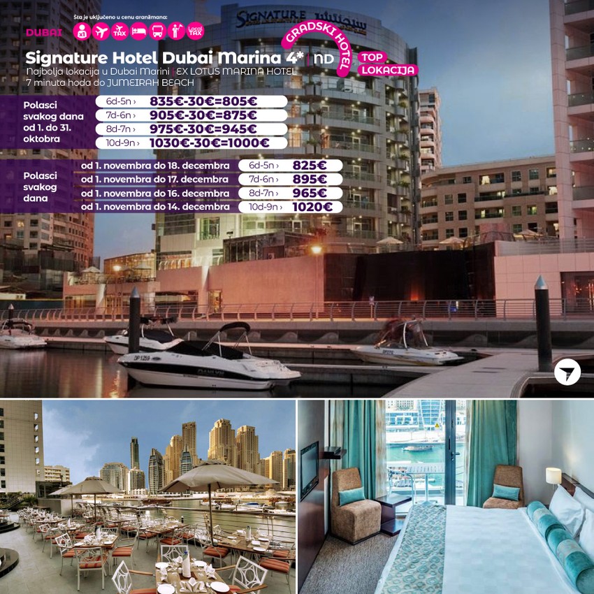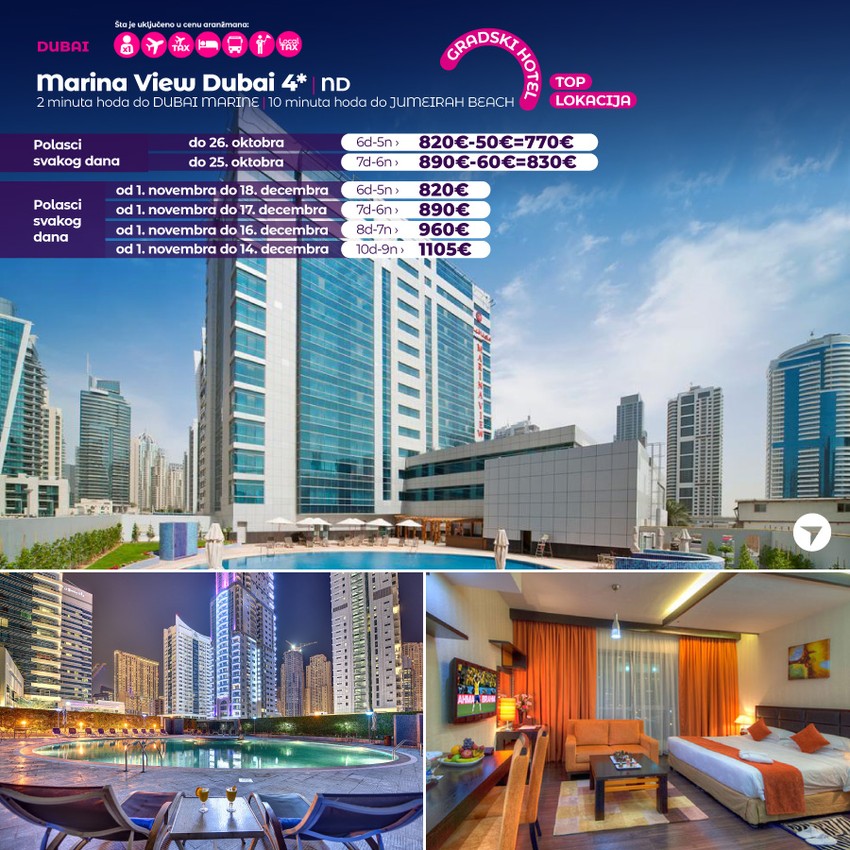 Ovaj moderan hotel se nalazi u srcu novog Dubaija u Dubai Marini. Sa prelepim pogledom na Marinu, hotel se nalazi nedaleko od glavnih tržnih centara Jumeirah Beach Residence, Marina Mall, Mall of Emirates i takođe se nalazi u neposrednoj blizini Jebel Ali Free Zone, Dubai Investment Park, Dubai Media City. Sve sobe su u vidu studija, jednokrevetni ili dvokrevetni deluxe apartmani. Svaka soba ili apartman je potpuno opremljen sa svim sto vam je potrebno za kraći ili duži boravak.