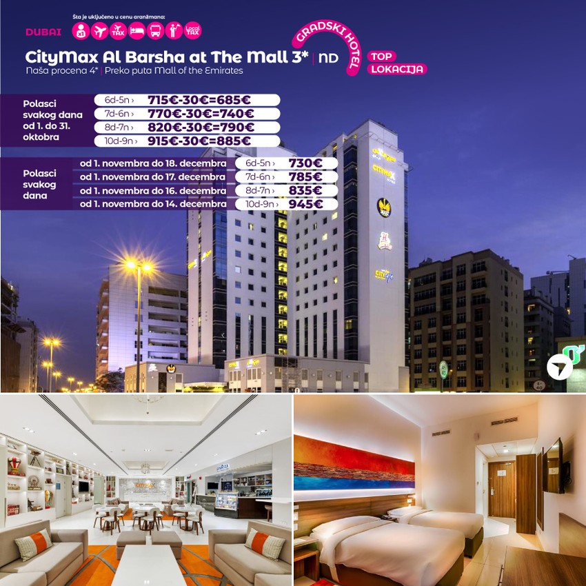 Objekat Citymax Hotel Al Barsha At The Mall nudi smeštaj prekoputa Mall of Emirates, jednog od najvećih tržnih centara u svetu. Park Džumeira Bič udaljen je 12 km. Besplatan WiFi je dostupan u celom hotelu. Sobe objekta Citymax Hotel Al Barsha At The Mall poseduju šik nameštaj. Svaka soba je moderno uređena i sadrži 32-inčni LCD TV.
