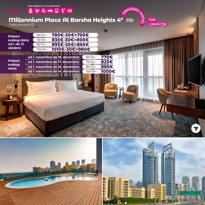 Ovaj hotel se nalazi se u Al Barsha oblasti, modernom delu Dubaija, nedaleko od hotela Byblos, Dubai Media City-a i ulice Shaikh Zayed, na idealnoj lokaciji kako za turiste tako i za poslovne ljude. Na 35 min vožnje od aerodroma.. Udaljen je 200 m od metro stanice odakle se metroom lako stiže do poznatih šoping centara (Mall of the Emirates ili Dubai Mall). Hotel poseduje 524 stilski uređenih soba, studija i apartmana. Sobe su spoj luksuza, komfora i udobnosti. Sve sobe su klimatizovane, imaju internet pristup, sto, LCD TV, sef, mini bar, telefon i opremljenu mini kuhinju (rešo, mikrotalasna pećnica, frižider) i kupatilo.