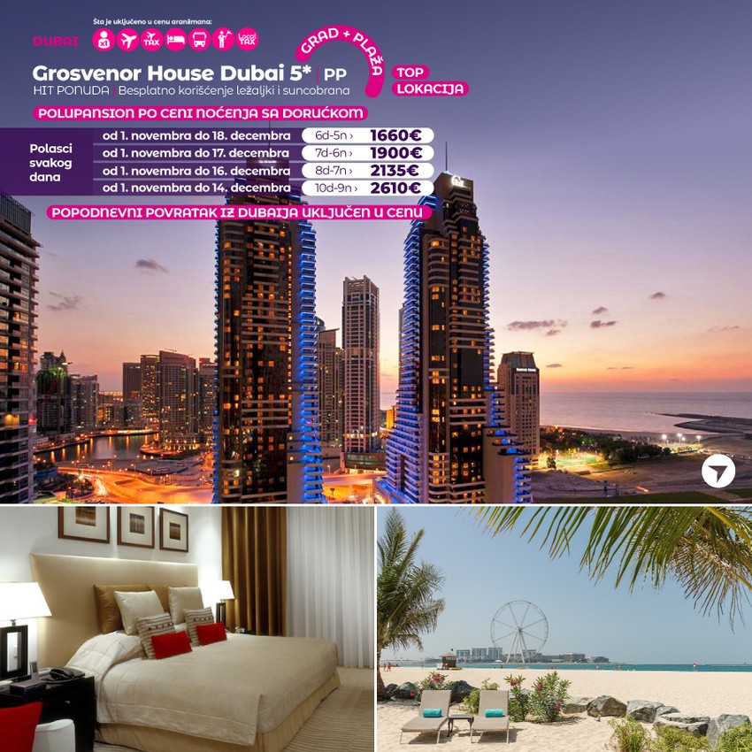 Grosvenor House je pojam luksuza, lociran na mestu sa koga se pruža veličanstven panoramski pogled na zaliv i Dubai marinu. Hotel raspolaže sa preko 400 soba sa odvojenom spavaćom sobom i dnevnom sobom. Sobe su opremljene sa kupatilom i kuhinjom, plazma Sat TV DVD/CD, internet konekcijom, frižiderom, telefonom i sefom. Od ostalih aktivnosti gostima hotela na raspolaganju je 5 restorana, od koji je jedan na otvorenom, 3 bara, kafić, fitnes i spa centar, đakuzi, sauna, bazen za odrasle i bazen za decu sa kontrolom temperature vode.......