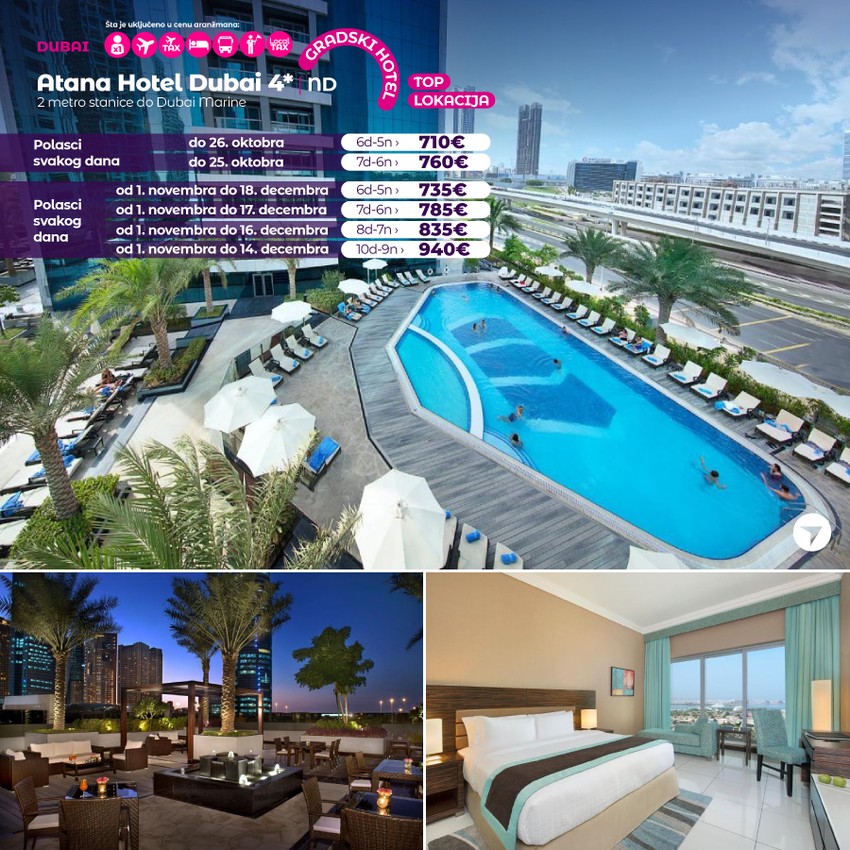 Ovaj hotel sa 4 zvezdice nalazi se na 5 minuta vožnje od tržnog centra Mall of Emirates. Gostima hotela Atana na raspolaganju su besplatan parking i besplatan WiFi. Sobe i suite jedinice su uređene u toplim tonovima. Sve sobe su opremljene LCD TV-om. Svaka smeštajna jedinica ima besplatan pribor za pripremu čaja/kafe. Hotel poseduje 3 ugostiteljska objekta različitih stilova u kojima se služe obroci tokom celog dana. Na raspolaganju su salonski kafe Piano i lokali sa hranom. Rekreativni sadržaji obuhvataju bazen na otvorenom sa terasom za sunčanje i potpuno opremljenu fitnes salu.