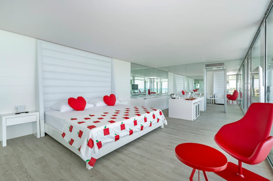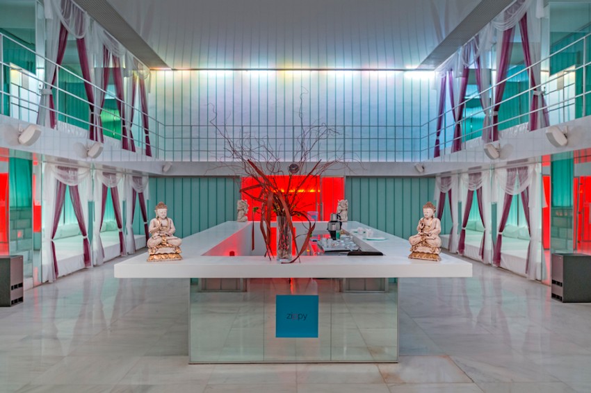 S obzirom da je ovaj restoran dizajniran za parove, u skladu sa tim možete večerati na crvenom krevetu. Baš kao ovi restorani, u hotelu je i sve drugo interesantno i koncipirano na specifičan način. Umesto fasade, hotel je čitav prekriven zelenom, veštačkom travom, a hol je ukrašen sa čak 4.980.000 ogledala.