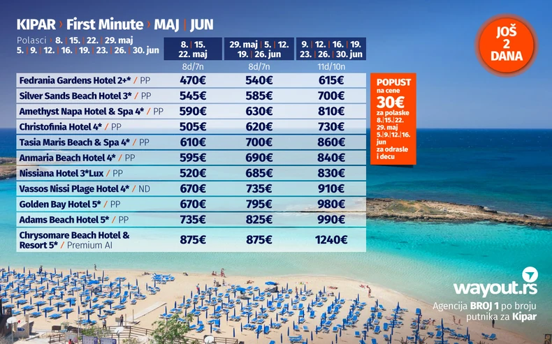First minute ponuda koja obuhvata polaske u maju i junu sastoji se od mešavine najtraženijih, najkvalitetnijih i najbolje ocenjenih hotela na Kipru, a sve to uz spektakularno povoljne cene, slobodno možemo reći i najpovoljnije do sad. Od hotela za ovaj period bismo izdvojili hotel sa fantastičnom plažom Park Beach u Larnaki, kao i hotele u Aja Napi koji se nalaze na odličnim lokacijama blizu plaža i samog šetališta, a to su Fedrania Gardens (jedan od najprodavanijih hotela na našem tržištu), zatim Pierre Anne Hotel koji se nalazi uz obalu, a svega nekoliko minuta hoda od samog centra Aja Nape, kao i Abacus Suites, luksuzni boutique hotel takođe nedaleko od plaže i centra svih zbivanja u Aja Napi. Svakako, ne smemo zaboraviti porodični hotel Callisto Holiday Village sa promocijom koja podrazumeva da dvoje dece do 14 godina ne plaćaju smeštaj, zatim jedan od najluksuznijih hotela u Protatarasu Constantinos The Great, kao i jedan od najluksuznijih hotela u Aja Napi Adams Beach, koji u Superior sobi može smestiti dvoje dece do 13 godina koja plaćaju samo avio kartu. Za ljubitelje luksuza, posebno izdvajamo hotel na samoj plaži u Limasolu, a to je Mediterranean Beach Hotel.