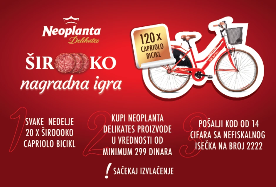Svake nedelje izvlačiće se po 20 dobitnika novog Capriolo bicikla, model Amsterdam lady 28“HT crvene boje, brendiran natpisom Neoplantine kampanje „Široooko“. Više o pravilu nagradne igre možete saznati klikom na link ka Pravilima.