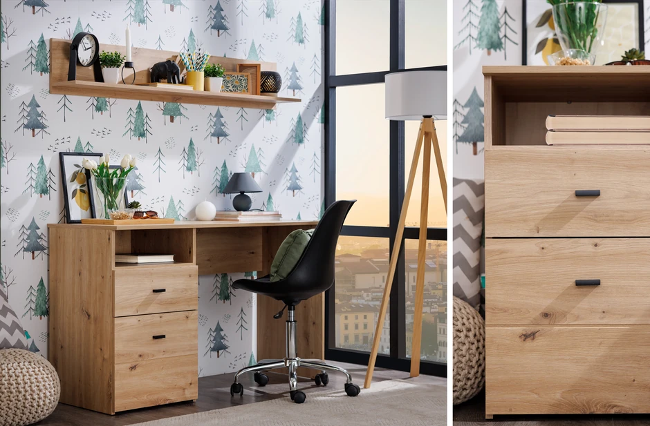 Minimalistički osmišljen radni kutak najbolje dolazi do izražaja kada se spoje funkcionalnost i toplina prirodnih materijala. Kompjuterski sto HIPATIA 2F, izrađen u dekoru artisan hrasta, unosi upravo takav balans - sveden dizajn upotpunjen je praktičnim rešenjima poput dve fioke (od kojih je jedna dublja) i otvorene police, pa je sve što vam je potrebno uvek uredno organizovano i na dohvat ruke. Njegove kompaktne dimenzije čine ga idealnim izborom i za manje prostore, bez kompromisa kada je reč o estetici.