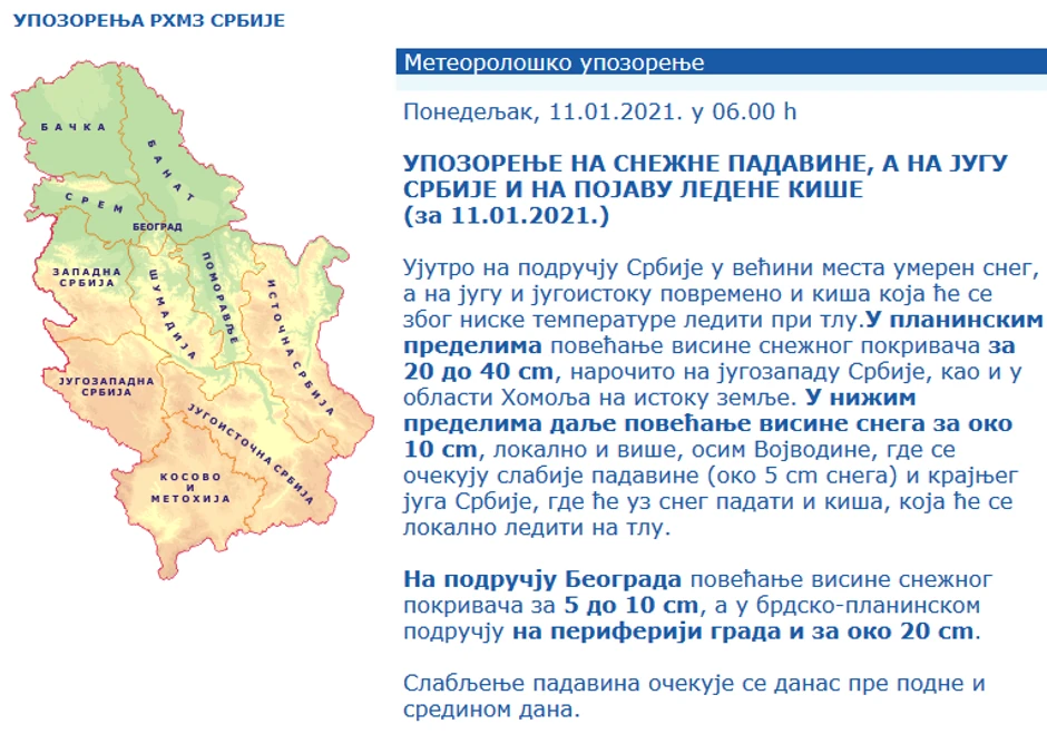 Republički hidrometeorološki zavod (RHMZ) objavio je da će jutros na području Srbije u većini mesta padati umeren sneg, a na jugu i jugoistoku povremeno i kiša koja će se zbog niske temperature lediti pri tlu.