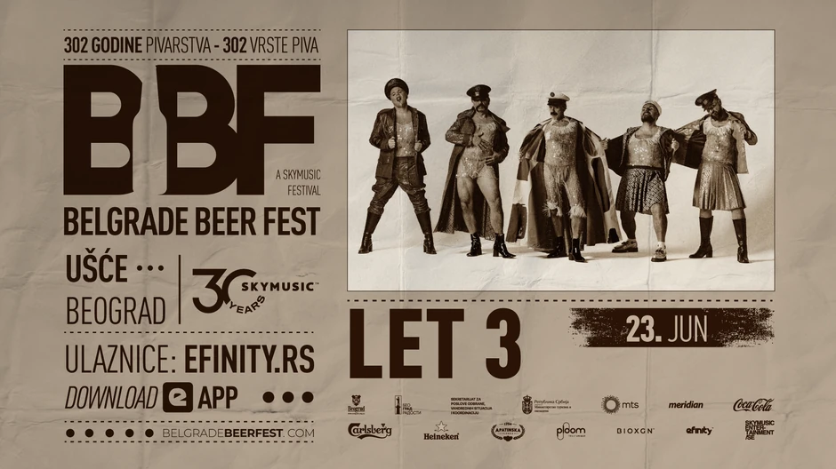 Belgrade Beer Fest, u organizaciji Skymusic-a, održava se na Ušću od 20. do 23. juna, a osim benda Let 3 tu si i Električni orgazam, Beogradski sindikat, Dubioza kolektiv, Sunshine, S.A.R.S, Galija, YU Grupa, Osvajači, Neverne bebe, Kanda Kodža i Nebojša, Smak Plus i Goblini, na Main Stage-u festivala. Na Electro bini svoje nastupe potvrdili su Marko Nastić i Lea Dobričić, dok će na Riff stage-u svirati Dram, Epilog, Plus 1, Stomp! i Senshi.