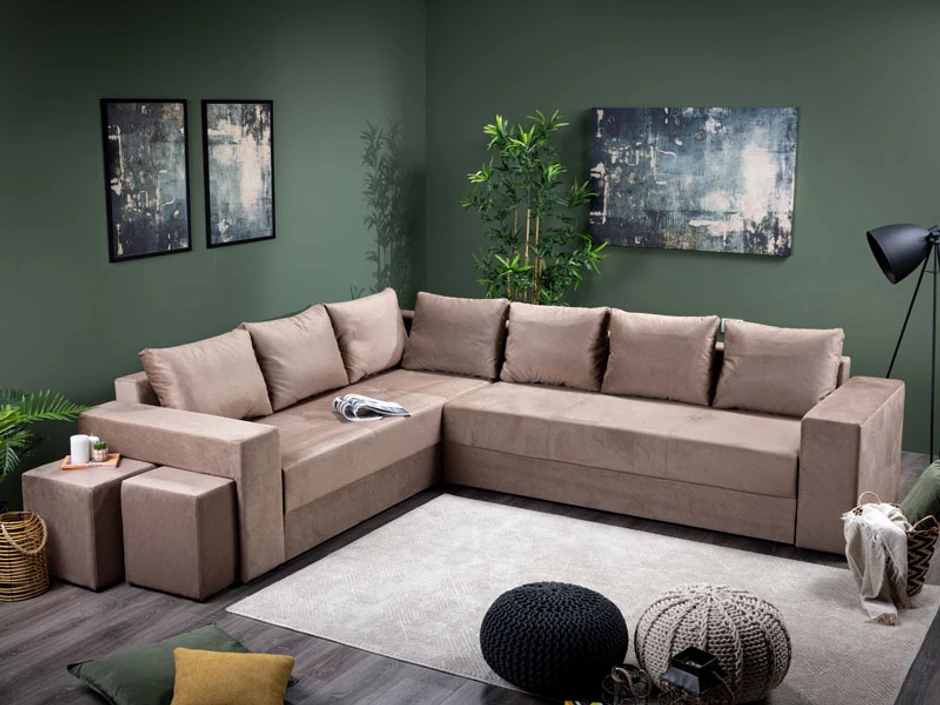 Ukoliko želite da promenite izgled dnevnog boravka, a potreban vam je komad tapaciranog nameštaja, predlog za idealnu kupovinu je prostrana ugaona garnitura LARA (sa dva taburea), a čija je loyalty cena tokom aktuelne akcije 69.990 dinara.
