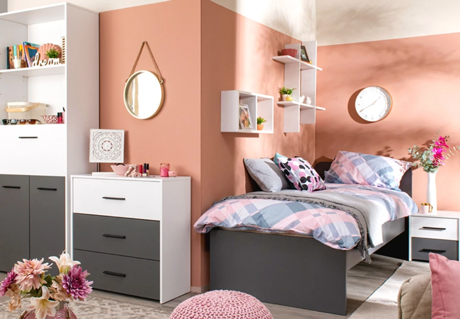 Kombinacija opak bele, grafit sive i lak bele folije sobe REBELO može da se prilagodi bilo kom trendu uređenja, pa dizajneri enterijera Forma Ideale predlažu da je dodatno utoplite pletenim boho detaljima, poput pletenog roze taburea, ili cvećem i korpama. Možete ostati i u monohromatskim notama, a napraviti fokusnu tačku neobičnim geometrijskim paternom na tepihu ili posteljini. Roze cveće u vazi na noćnom ormariću REBELO NO2F doprineće potpunom osveženju ambijenta.