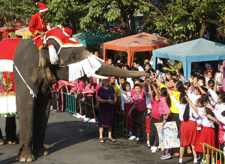 Ova tradicija duga 15 godina, dešava se u jednoj osnovnoj školi u gradu Ajutaja na Tajlandu. Tada slonovi obučeni u svečana, šljokičava odela donose osnovcima slatkiše i poklone, sve, naravno, pod nadzorom dresera. Tradicija se i ove godine održala, a četiri slona nisu deci doneli samo poklone i poslastice već su i plesala za njih, izvodili trikove, a na kraju su svi zajedno kitili jelku.