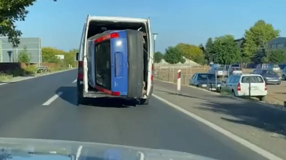 I kao da cela ova situacija nije dovoljno bizarna, još jedan detaljčić privlači pažnju - auto nije čak ni vezan. Deluje da je samo uguran u kombi, i da svakog momenta može da sklizne, i napravi karambol.