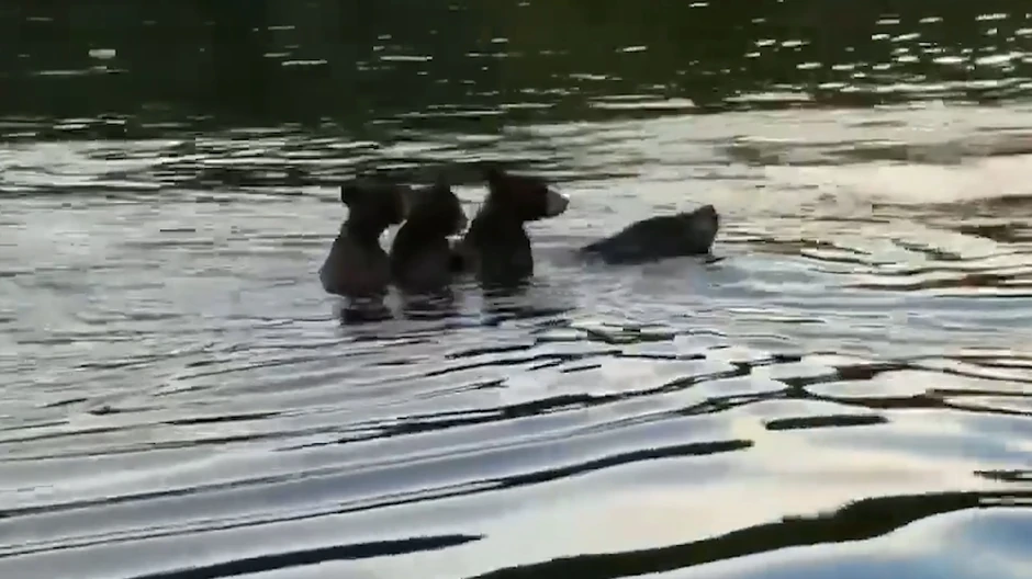 Jedna medvedica je očigledno imala jak razlog da pređe sa svojim mladuncima sa jedne na drugu obalu jezera, pa je rešila da to uradi noseći na leđima sve troje medvedića.