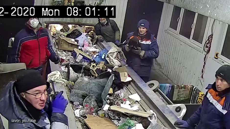 Na snimcima nadzornih kamera koji kruže internetom vidi se kako radnik u pogonu tokom sortiranja smeća iz zavezane plastične kese koja se našla na pokretnoj traci, piše "Moskou tajms".