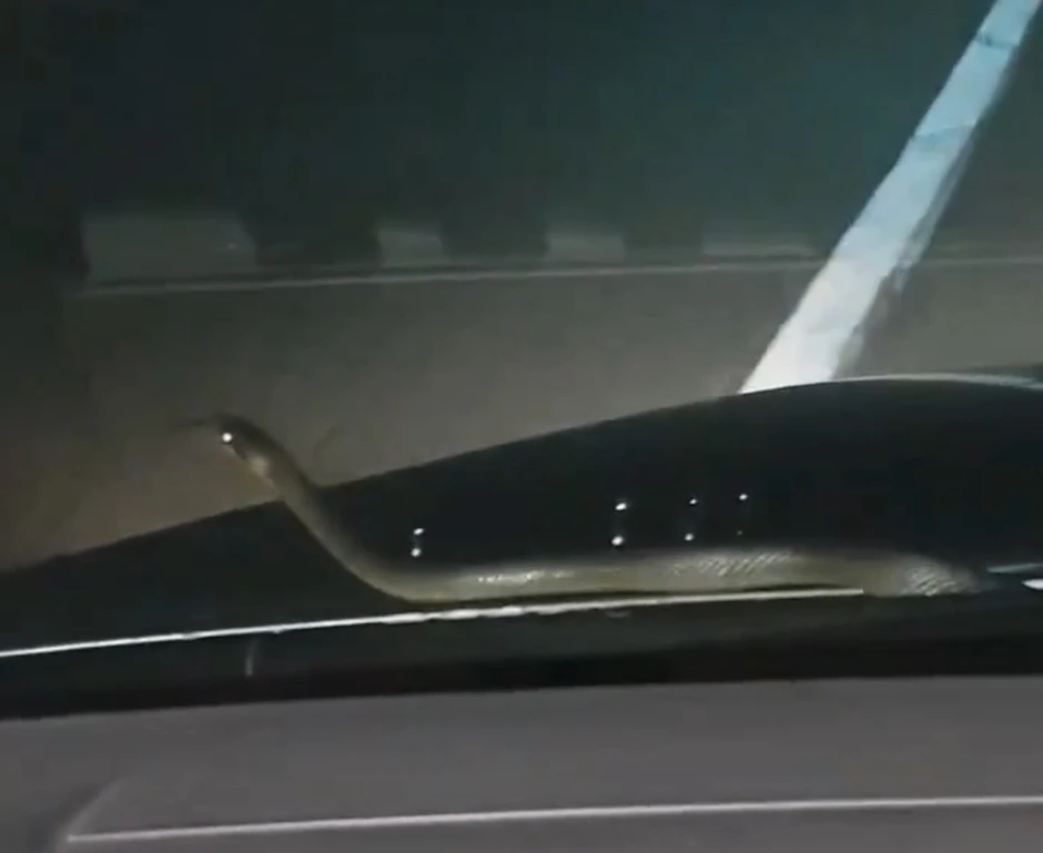 Na njemu se vidi zmija duža od jednog metara kako izlazi iz haube i kreće se po šoferšajbni.