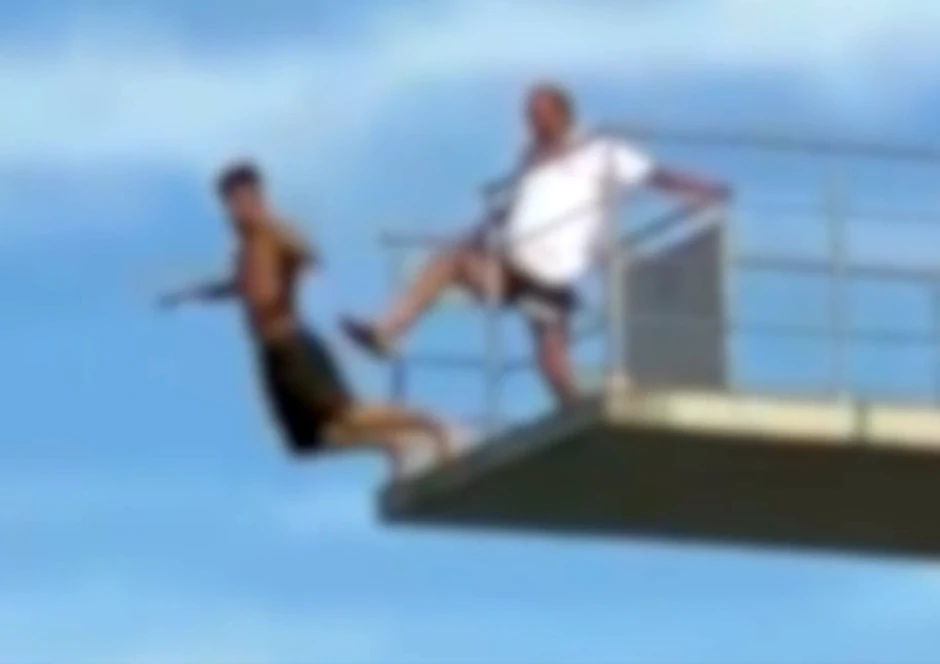 Kako se može videti, gost drži za ogradu, a onda ga spasilac gura nogom u leđa. Od udarca, čovek pada desetak metara, a pre nego što udari u vodu, vidi se da se kupač drži za nos.