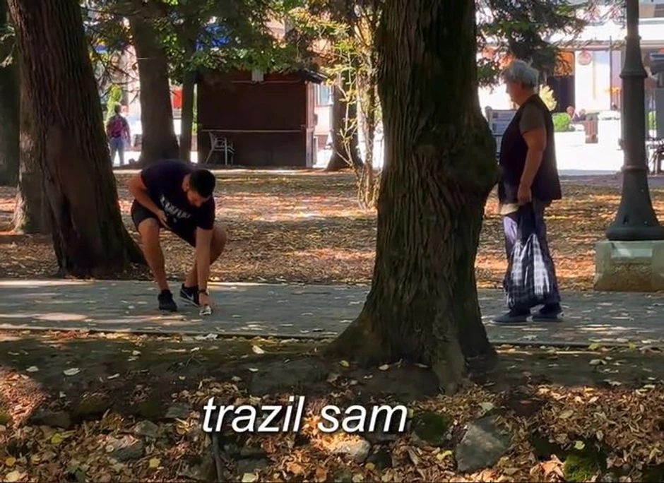 Video koji je oslovio sa "Pohlepne babe" snimio je u Vrnjačkoj banji na jednom od banjskih šetališta. Dok se on nalazio u šumi i "pecao" žrtve, kamera se nalazila nešto dalje. Kada je video da mu u susret idu dve bake, spustio je na ulicu 5.000 dinara.