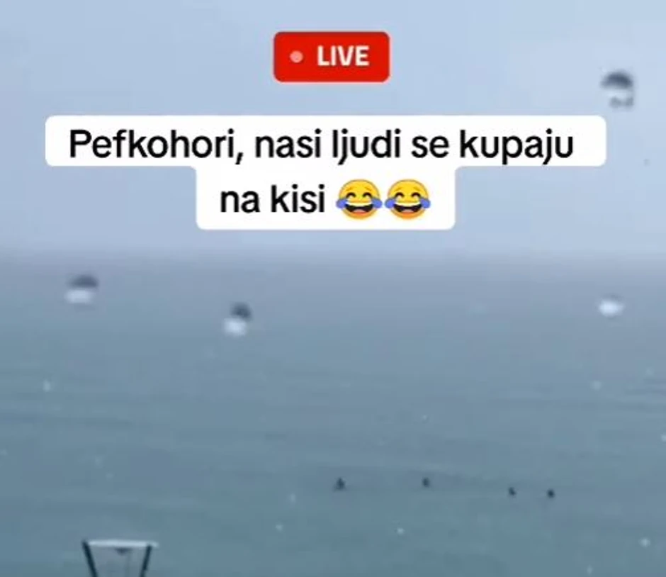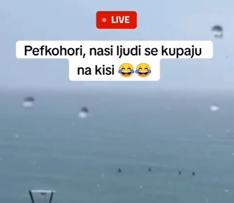 Snimak se pojavio juče tokom dana, a sudeći po snimku, vreme nije bilo baš za kupanje, što našim ljudima očito nije smetalo. Kako se vidi na snimku, četvoro ljudi se kupalo na centralnoj gradskoj plaži u Pefkohoriju, te im ni jak pljusak ni vetar nisu pokvarili uživanje tokom letovanja u Grčkoj.