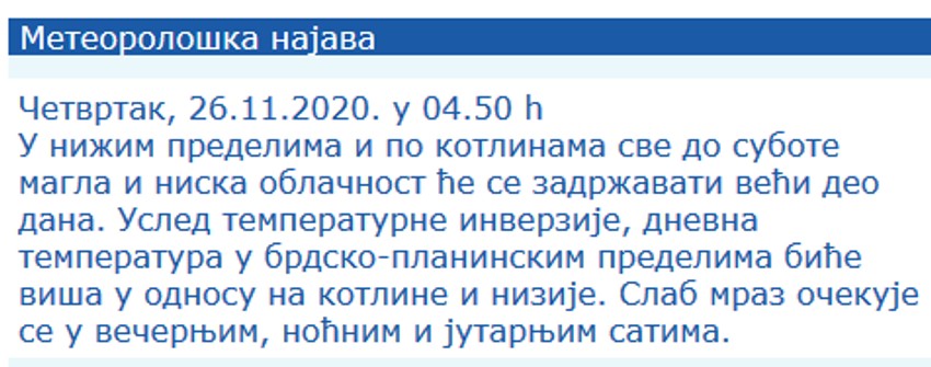Ono što je danas posebno zanimljivo jeste fenomen temperaturne inverzije, na koju ukazuju iz Republičkog hidrometeorološkog zavoda (RHMZ), te je usled ove pojave temperatura u brdsko-planinskim predelima jutors bila viša u odnosu na kotline i nizije.