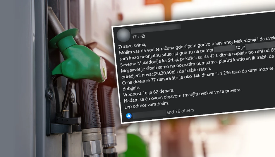 "Zdravo svima, molim vas da vodite računa gde sipate gorivo u Severnoj Makedoniji i da uvek tražite račun. Juče sam imao neprijatnu situaciju gde su na izlazu iz Severne Makedonije ka Srbiji, pokušali da mi 42l dizela naplate po ceni od 68 evra.