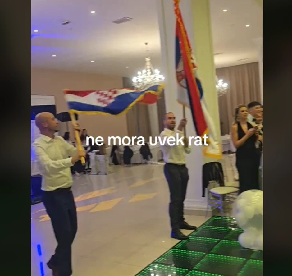 Na videu objavljenom na TikTok profilu "urosss034" mogu se videti momci koji su ponosno u svečanoj sali uneli svoje zastave. Jedan srpsku, drugi hrvatsku. Zastave su se vijorile u ritmu muzike, dok su mladenci i gosti zajedničkim snagama slavili ljubav.