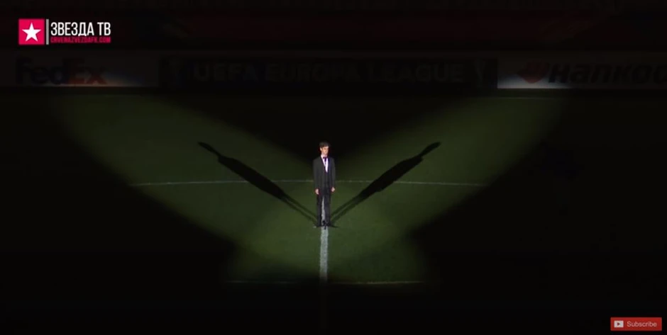 U kožnoj jakni, sa frizurom koja je neodoljivo podsećala na kralja rokenrola, Elvisa Prislija, Nemanja je koračao kroz tunel "u kome i najhrabrijima klecaju noge i na čijem izlasku dečaci postaju muškarci", ušao je na teren, da bi se, kada je došao na centar terena, počeo njegov trenutak. Trenutak u kome je spojio dve svoje najveće ljubavi, muziku i Crvenu Zvezdu.