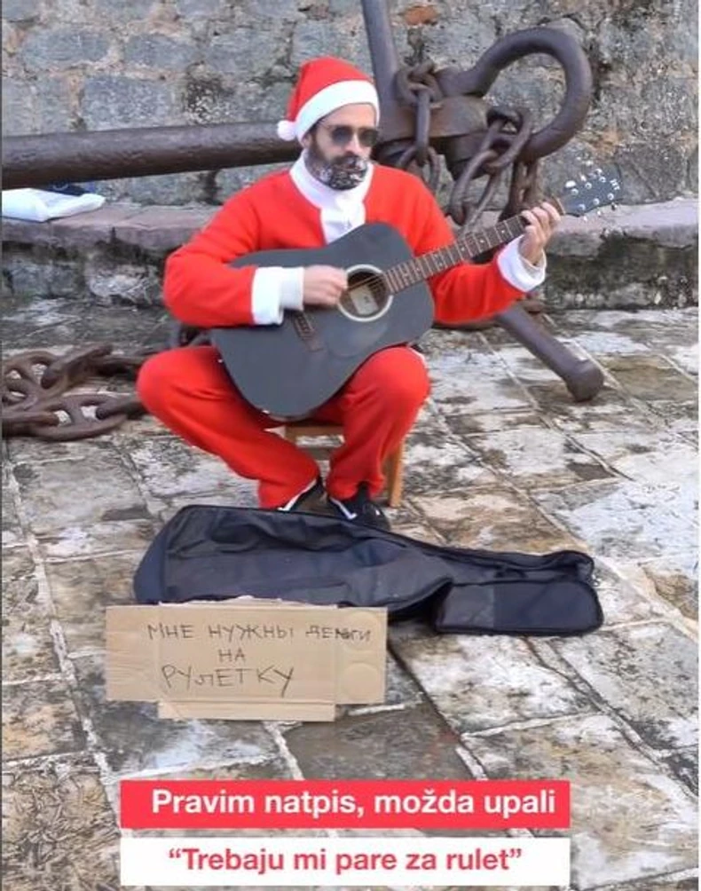 Ovog jutra, Strahinja je postavio video snimak u kojem je pokušao da animira javnost da se uključi u nekoliko humanitarnih priča. I to možda, nažalost ne bi urodilo plodom i odjeknulo na društvenim mrežama, da nije obukao kostim Deda Mraza, uzeo gitaru i počeo da svira na ulicama Budve. Uz poruke koje su bile šaljive prirode, mamio je prolaznike da mu ubace koji evro u tortbu gitare, govoreći kako mu je ovo prvi put da nastupa, ali da mu je novac "potreban za ruku na ruletu".