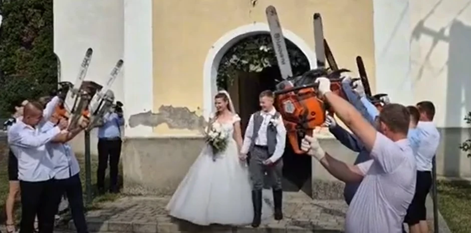 Izlazak iz crkve za jedan mladi bračni par pretvorio se u nesvakidašnji prizor koji niko nije mogao da zamisli, pa ni oni sami jer ih je umesto cvetnih latica i tradicionalnog aplauza, dočekao neočekivani zvuk motornih testera.