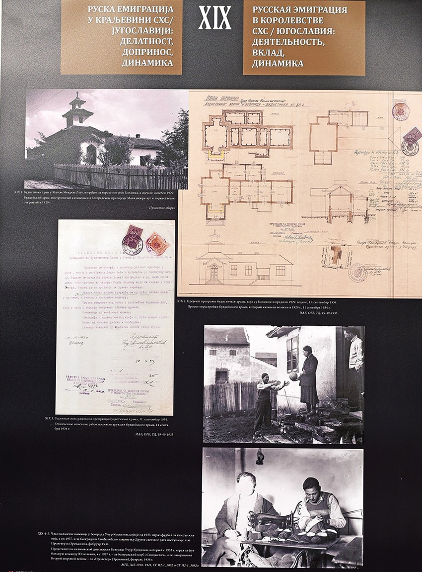 Povučeniji život vodili su Kalmici, narod mongolskog porekla i budističke vere, koji su početkom dvadesetih godina pristigli u Kraljevinu SHS i čija je većina od oko 500 ljudi stanovala u predgrađu prestonice, od Karaburme i Malog Mokrog Luga do Crvenog krsta. To je bila zatvorena grupa ljudi. Sa meštanima i ostalim emigrantima kontaktirali su samo kada su morali. Najveći broj njih radio je po ciglanama, ali i na kopanju temelja za višespratnice, budući da većina nije imala nikakve kvalifikacije. Za njihove verske potrebe izgrađen je budistički hram u Malom Mokrom Lugu 1929. godine, i ulica je nazvana Budistička. Na izložbi je dokument o rušenju budističkog hrama 1951. da bi se izgradila fiskulturna sala.