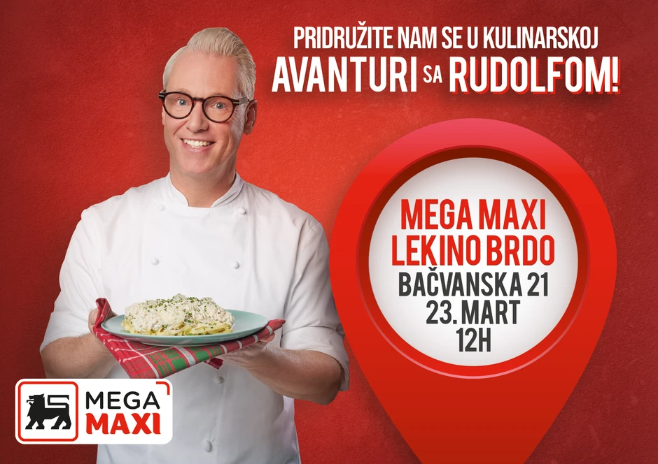 Jedinstveni kulinarski šou u MEGA MAXI hipermarketu na Lekinom brdu počinje u 12 časova. Tokom četvoročasovnog nastupa Rudof će pripremati svoja jela. Na njegovom gastronomskom jelovniku naći će se specijaliteti „Pasta beli Bolonjez " i veganski "File Ameriken“.