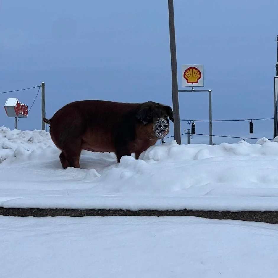 Policija je podelila fotografije svinje s njuškom prekrivenom snegom dok se igrala u blizini benzinske pumpe, a prizor je oduševio mnoge korisnike interneta širom sveta.
