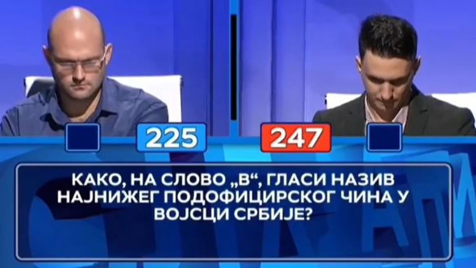 U toku je jubilarno izdanje "Slagalice" povodom 30 godina kviza, a jedna situacija izazvala je pažnju gledalaca. Takmičari Branimir Arsić i Ivan Gavrilović su tokom igre "Ko zna, zna" dobili i pitanje o vojsci koje glasi: "Kako, na slovo "v", glasi naziv najnižeg podoficirskog čina u Vojsci Srbije?"