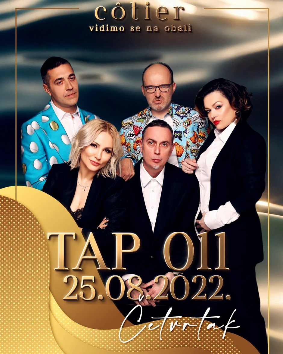 Neprikosnovena pop i dance grupa TAP 011 specijalno nastupaju na splavu Cotier u četvrtak 25.08. u Beogradu. Devedesetih su bili sinonim pop muzike Balkana, a za ovaj popularni beogradski splav pripremaju najpoznatije hitove koji su obeležili celu deceniju naše scene.
