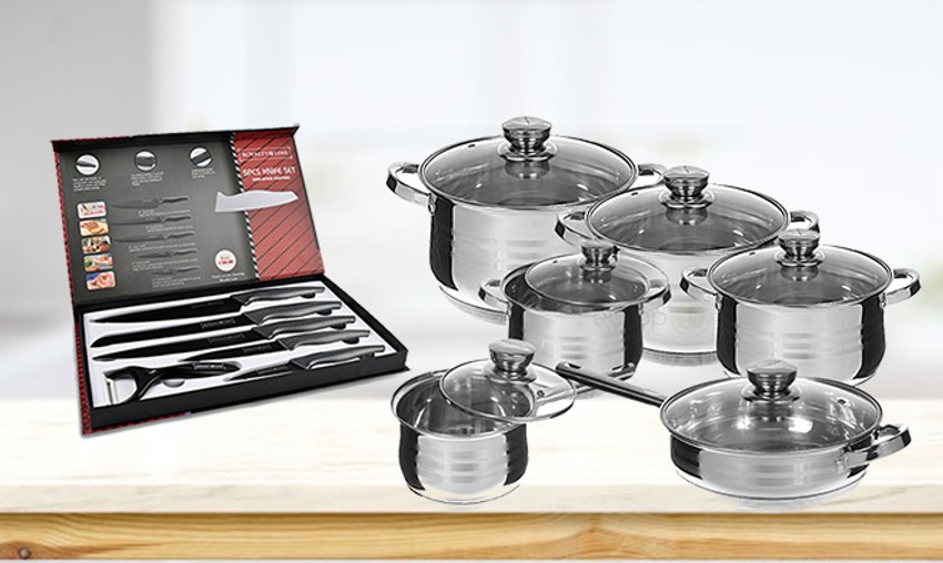 Više vam tokom kuvanja neće zafaliti nijedan nož ili posuda! Posuđe je bitno koliko i izbor svežih namirnica, zato nećete pogrešiti uz set posuđa Royalty Line koji sadrži 12 delova. Izrađen je od kvalitetnog nerđajućeg čelika, a sadrži tiganj, pet šerpi različitih veličina i šest staklenih poklopaca. Ovaj fenomenalan set može biti vaš na akciji za 5.999 dinara na sajtu grupi.rs, a ukoliko se odlučite za ponudu sa setom noževa možete je dobiti za samo 6.999 dinara.