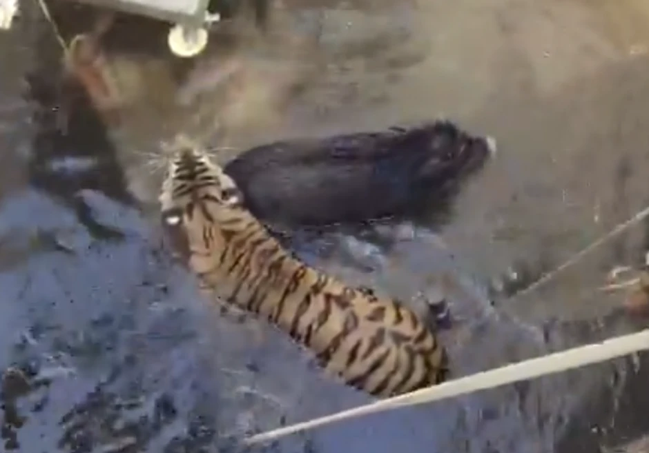 Neobična scena odigrala se u indijskoj saveznoj državi Madja Pradeš kada su mlada tigrica i divlja svinja, slučajno završile zarobljene u bunaru. U dramatičnom spletu okolnosti, tigrica je jureći svoj plen kroz šumu nespretno upala u duboku rupu ispunjenu vodom, povukavši za sobom i svinju.