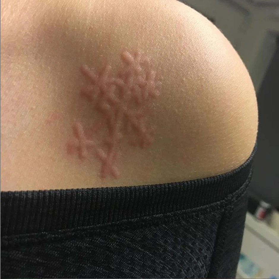 Ema Oldenrud (18) iz Danske ima retko stanje kože poznato kao dermatografija, zbog toga što njena koža postaje crvena i otečena na dodir. Kad god joj se jave ovi problemi, ona koristi priliku da olovkom dodiruje svoju kožu stvarajući šare i reči koje postaju vidljive tek kada njena koža odreaguje, piše "Unilad".