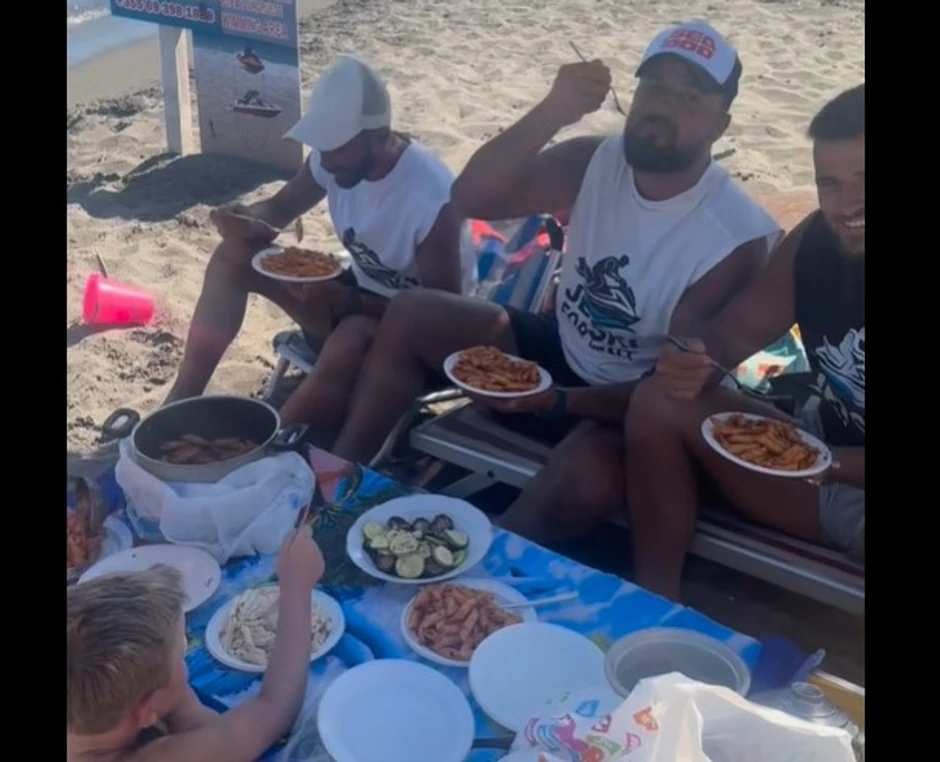 "Iz edicije 'Neće nas niko pljačkati'", stoji u opisu snimka na kojem se vidi kako je nekolicina turista, uglavnom muškaraca, okupljena oko ležaljke na kojoj je postavljena hrana, sa zadovoljstvom i osmehom na licu započela svoj ručak.