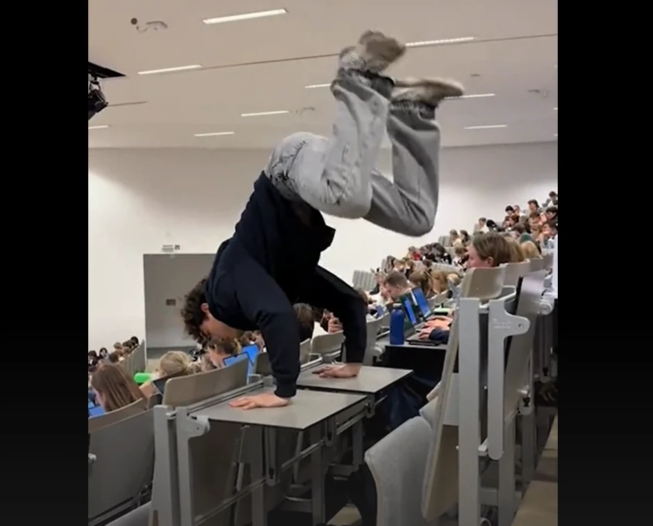 Naime, dok su studenti pažljivo pratili predavanje, Arne Smets, dvadesetogodišnjak i praktičar kalistenike, izveo je stoj na rukama, a potom u tom položaju izveo i nekoliko sklekova. To je kaže uradio samo zbog jednog cilja - da postane viralan.