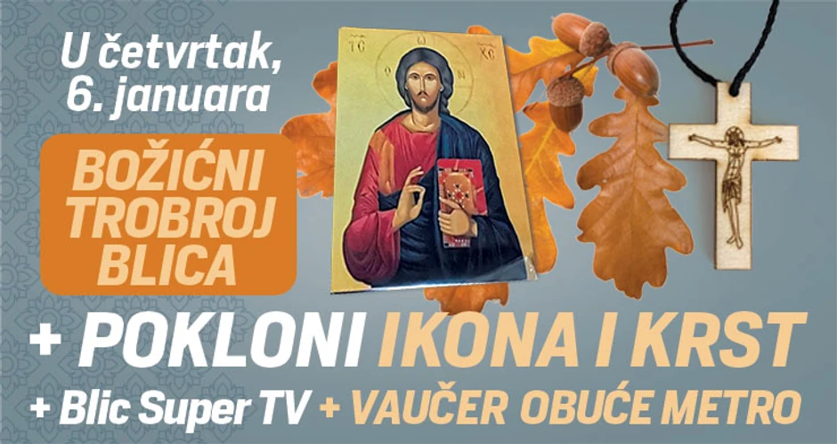 Povodom ovog velikog praznika u trobroju "Blica", koji sve čitaoce čeka u četvrtak, 6. januara na kioscima, pronaći ćete privezak krst na kom je prikazano raspeće Isusa Hrista, kao i ikonu, a na poklon vas čeka i vaučer za kupovinu u svim radnjama "Obuće Metro" širom Srbije, kao i Super tv magazin sa najdetaljnijim televizijskim programom.