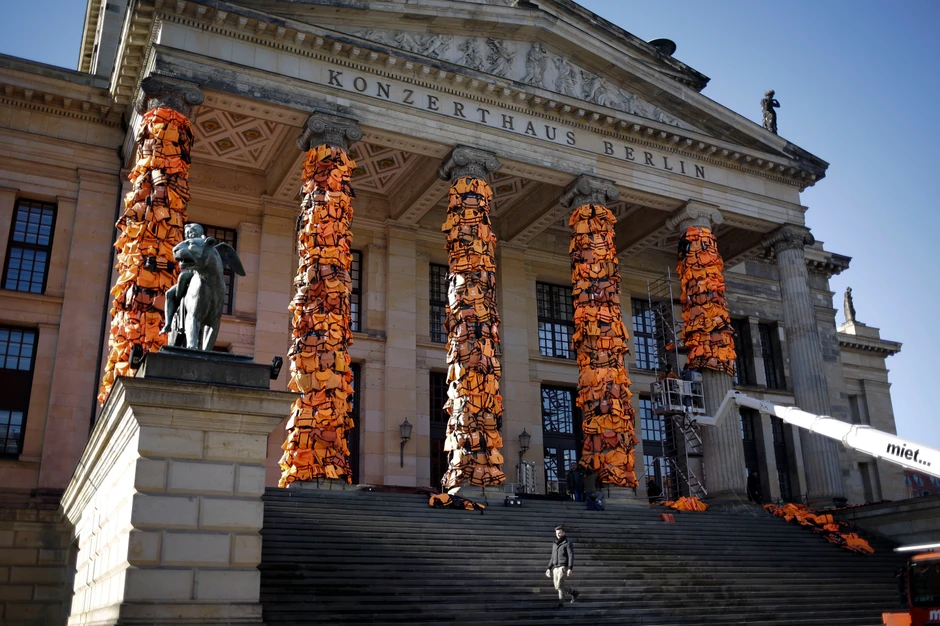 Članovi tima kineskog umenika omotali su stubove Berlinskog koncertnog zdanja jarko narandžastim prslucima kako bi skrenuli pažnju na stradanje izbeglica koje svakodnevno pokušavaju da iz Turske preko mora predju u Evropu.